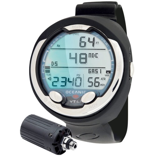 Interface advancements that change the face of dive computers: The Oceanic VT4 1 takes yet another step forward in continuing a reputation of ruggedness and reliability while making advancements in Personal Dive Computer (PDC) usability. The VT 4.1 Dive Computer out-of-the-box ready for your dive today and ready to follow you onto more advanced dives in the future. With Oceanic's wireless transmitter, the diver can also monitor gas pressure from up to four independent cylinders ideal for both technical diving applications and recreational diving.