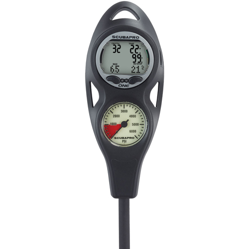 The submersible pressure gauge (SPG) has a readout from 0 to 6,000 in 1,000, 2,000, 3,000, 4,000, 5,000 and 6,000 psi numerical increments. A red reserve air zone displays at 0 to 1,000 psi for safety in low air situations. The SPG has a luminous dial for easy reading in low light or night diving conditions. The pressure gauge comes with a 7/16" threaded 34.5" (87.5cm) high pressure hose. Both the computer and pressure gauge are housed in a durable rubber boot with multiple attachment points for clips and lanyards.