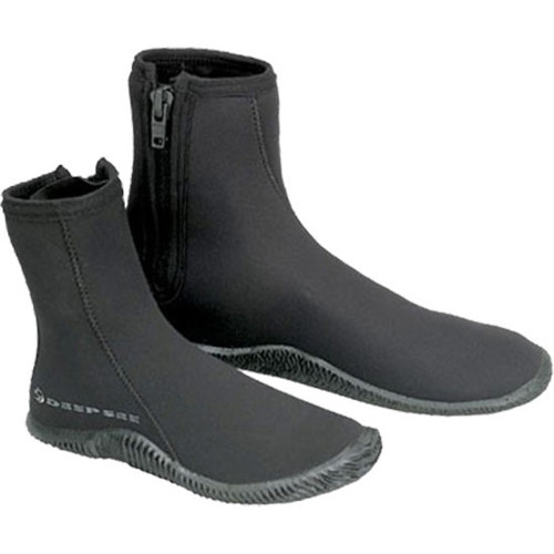 The Deep See 5mm EchoZip Boot is made from nylon-2 neoprene has a flexible vulcanized rubber sole and four seam (2 front, 2 heel) pattern. Boots have a non-corrosive heavy-duty zipper for easy donning and doffing. Seams are glued and sewn for strength and durability. The boots outer sole has a ridged grip bottom pattern for positive traction on slippery surfaces. Top edge is taped and sewn. Boots are black in color and available in multiple sizes.