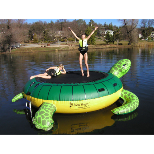 The Island Hopper Turtle Hop sets up in minutes and is easy to transport. Constructed of sturdy 30-gauge PVC material with radio frequency (RF) electronically welded seams, the graphically enhanced, independently chambered head, arms and feet provide a wider and more stable platform and will add to the kids' swimming enjoyment. The built-in, spring-less polypropylene bouncer surface is a perfect soft platform for adult lounging and the kids will enjoy hopping (less than spring assisted jumping) into the water. The Island Hopper Turtle Hop comes as a complete set and requires no assembly...just blow it up and start hopping.