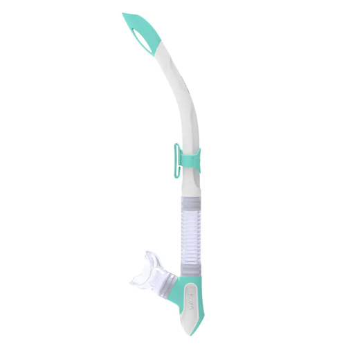 The Mares Ergo Splash Snorkel features a unique combination of a semi-dry top with an exhaust valve, and an additional exhaust valve integrated within the mouthpiece. This design makes it intuitive and user-friendly, even for beginners.