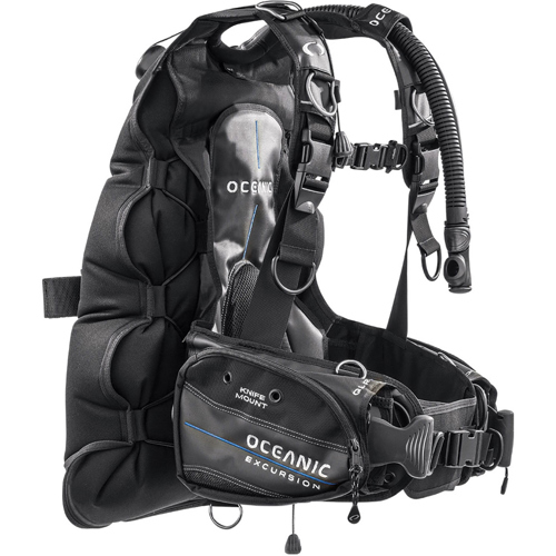 The Oceanic Excursion has torso adjustable shoulder straps. The shoulder straps, waist strap and sternum strap all come equipped with squeeze-style" quick-release buckles for easy of donning and doffing. The BCD also comes standard with Oceanic's patented adjustable depth compensating cummerbund. The BCD's bladder retains its low-profile with integrated bungees. BCD comes equipped with Oceanic's Alliance integrated inflator. Ergonomically designed to be functional and easy-to-use in any dive position, the Alliance integrated inflator provides a full-range of airway exhaust/inflation control. Simply press a button to produce-precise flow for trimming dive attitude or maximum flow for major-changes in buoyancy. A large exhaust valve creates a flow-rate higher than the inflation rate of the power inflator, improving diver control during ascents. To add to your buoyancy, control the Excursion has a right back pull-ball and left shoulder exhaust/overpressure relief valves. The Excursion comes with a 3/8" threaded low pressure quick-disconnect hose, is black in color, available in multiple sizes, and includes an owner's manual.