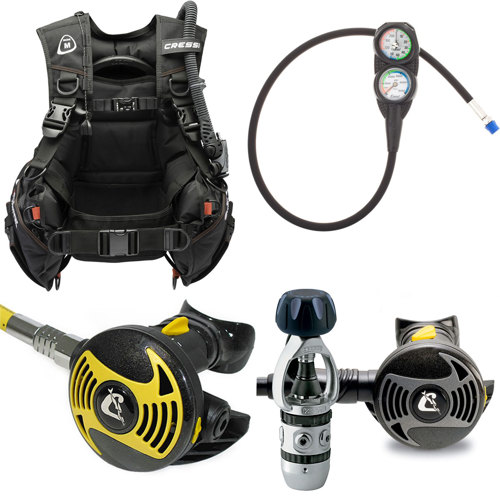 Buoyancy control is made easy with the 3-exhaust valves and Cressi's Power Inflator that comes standard with a 3/8" threaded low-pressure quick-disconnect hose. Adjusting the BCD to size is facilitated by the torso adjustable shoulders, sternum, and waist straps. All straps are equipped with "squeeze-style" side-release buckles for quick-and-easy donning and doffing. The Start Pro BC provides lift capacities of 29.2 lbs. to 45 lbs. (13.25kg to 20.14kg) depending on the size. BCD has a single cam cylinder band and comes with an owner's manual.