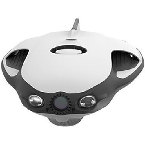 The drone's specifications are as follows: Camera; Image sensor 1/2.3" CMOS, Resolution; photo 12 MP: 4000 x 3000, video 4K;3840 x 2160 / 30p, 2.8K; 2880 x 2160 / 30p, 2.5K;2560 x 1440 / 60p, 2.5K; 2560 x 1440 / 30p, Full HD; 1920 x 1080 / 100p, Full HD; 1920 x 1080 / 60p, Full HD; 1920 x 1080 / 30p, HD;1280 x 720 / 200p, aspect ratio; 16:9, file formats photo JPEG, PNG, video MP4, MOV (MPEG-4 AVC/H.264), lens aperture f/2.8, shutter speed 1/30 - 60 sec. ISO sensitivity 100-1600, burst mode 5.0 fps, slow motion (video) 3x, 4x, memory 32 GB card. ROV: Depth rating 98' (30 meters), speed max. cruising 3-4 knots (1.5-2.0 m/s), max. ascending 0.8 knots (0.4 m/s), max. descending 0.6 knots (0.3 m/s), connectivity; 210' (64 meters) tether to topside base station, internal Wi-Fi allows transmission of images and data over distance of up to 262' (80 meters), lighting 2x adjustable front LEDs, 1x LED tail light power battery with 6400mAh capacity and 94.72Wh energy consumption rate, 1x vertical and 1x horizontal motor, run time high speed 1 hour, low speed 2 hours, operating temperature 14°F to 122°F (-10°C to 50°C), dimensions 10.7" x 5.0" x 18.3" (27cm x 12.6cm x 46.5 cm), weight w/battery 14 lbs. (6.4 kg) w/o battery 8.4 lbs. (3.8 kg). Base Station; connectivity; 210' (64 meters) tether to ROV, Wi-Fi with 98' (30 meter) range, battery capacity 3000 mAh, run time up to 4 hours, status indicator green (over 60% power), yellow (60-20%), and red (under 20%), weight approx. 7.1 oz. (200 g). Charger; voltage 16.8 V, charging time approx. 2.0 hours. Transmitter (remote control) connectivity Wi-Fi connection to base station, operating frequency 2.4 to 2.483 GHz, Wi-Fi range up to 32.8' (10 meters), operating temperature 14°F to 122°F (-10°C to 50°C).