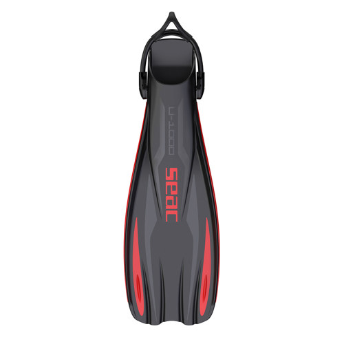 The U-1000 fins are expertly crafted for divers who require exceptional performance and powerful thrust. Built with ultra-resistant materials, these fins are designed for professional use and can withstand the rigors of demanding dives. A specialized thermoplastic polymer gives the fins a robust structure that remains durable over time, resisting shocks, abrasions, and sudden temperature changes. The rubber surface inside the blade is precision-bent to create a "spoon effect," which moves a larger volume of water, delivering enhanced thrust. The foot pocket of this fins features a non-slip sole and is easy to slip on with elastic Sling Strap. These fins are also negatively buoyant, which neutralizes the positive buoyancy of neoprene dive boots, providing better control underwater. In addition to their performance, the fins boast a sophisticated design with striking lines and graphics, making them both functional and visually appealing.