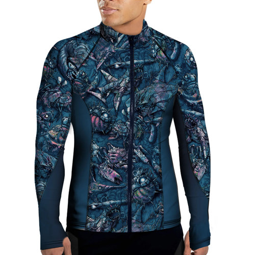 The Clockwork Ocean design features intricate illustrations of mechanical marine life, including sharks, turtles, mantis shrimp, and pufferfish. This surf rash guard for men combines artistic detail with functional performance, making it suitable for water sports and casual wear.