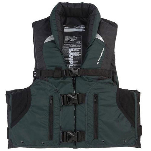 Catch your limit even when it's brisk outside in a Stearns Compression Life Vest. It's designed with four pockets two tackle-box sized zippered compartments and two fleece-lined side-entry handwarmer sleeves. A soft, stand-up collar even blocks chilly winds on your neck. The US Coast Guard-approved Type III PFD is constructed with durable 200D nylon shell, soft PVC foam inside, and three adjustable chest straps. You're sure to be wearing it when you catch your limit more times than you can count.