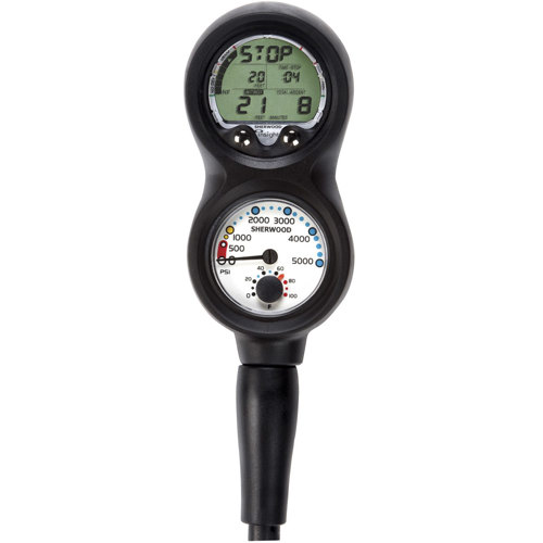 The Sherwood Insight Dive Computer Compact Console is a low profiled and ergonomically designed to fit in the hand comfortably and is easy to read at a glance with its outstanding-graphics. The Sherwood InSight Nitrox Dive Computer features an exceptionally intuitive display with an air/nitrox or gauge mode, three screens in dive mode, imperial or metric measurements and dive log sample rate. Computer has a pre-dive planner that provides depth, time of day (dive & surface), and 24-hour or 12-hour time modes. All these modes are user selected. The InSight's intuitive display popularized by Wisdom model has a 1.75" (44.45mm) diameter display when in surface mode will display date, time of day, surface interval, modes of air/nitrox or gauge and a bar graph indicating nitrogen status.