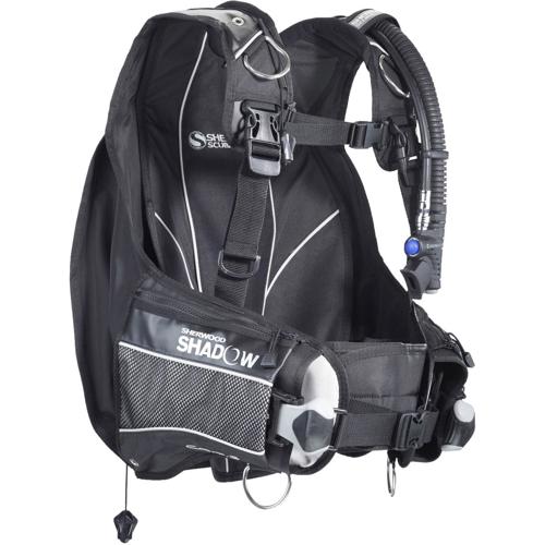 Sherwood's newest hybrid BC the Shadow, with maximum utility and convenience. This BC features a back mounted air cell to leave the chest area open for freedom of movement, but also provides some wrap-around buoyancy for added lift and vertical stability. The cleverly designed zippered side pockets expand for extra storage when it's needed most. The Shadow's large air cell provides significant lift capacity of 32 lbs. to 46 lbs. (15.5 kg to 21 kg). BCD is equipped with a padded neoprene neckline and plush interior lining for added comfort.