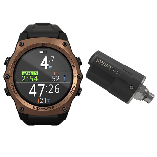 Every Shearwater air integrated dive computer can lock in your dive site location coordinates with the Swift GPS. Get more than the benefits of air integration when you capture your dive's entry and exit points, and add maps to your Dive Shearwater log.