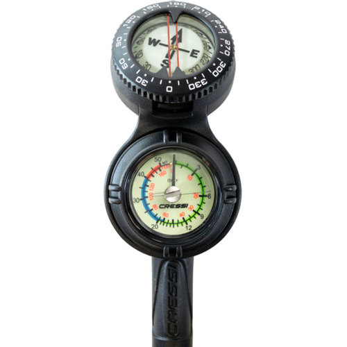 The Cressi Console CPD3 combines a Compass, a Pressure Gauge and a Depth Gauge. It's a very important instrument for monitoring the scuba equipment and increases dive safe. The Compass features a rotating bezel for easy navigation. The Submersible Pressure Gauge has a color-coded scale that the divers can read at a glance. The pressure gauge reads pressures up to 5000 PSI/350 BAR. The Depth Gauge reads to the depth of 230 feet/70 meters. The pressure and depth gauges are built with chrome-plated brass cases for maximum durability. The textured boot is easy to handle, even while wearing gloves, and can be rigged with a clip or bungee for secured to the diver's BCD for a streamlined profile in the water. The complete console weighs (including hose) 16 oz. (456g). The hose measures 30" (76cm) in length.